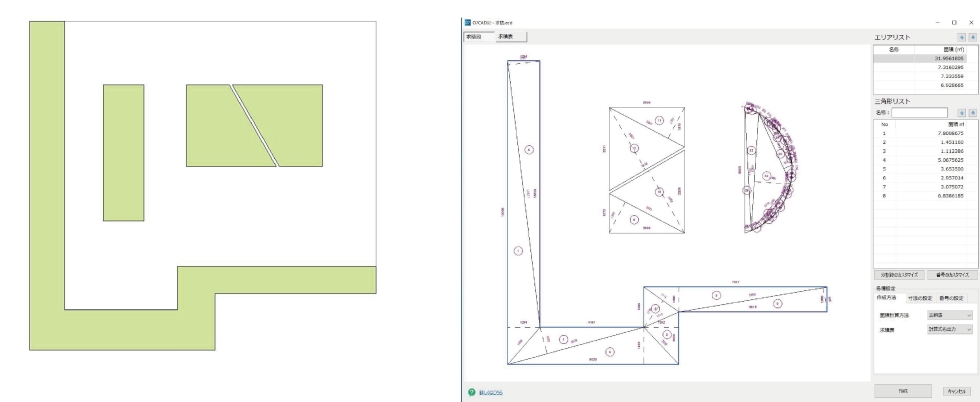 敷地・床・低木・地被の面積を自動で計算し求積図を作成します。面積計算方法の他に、分割線や番号、寸法・文字の色も変更できます。