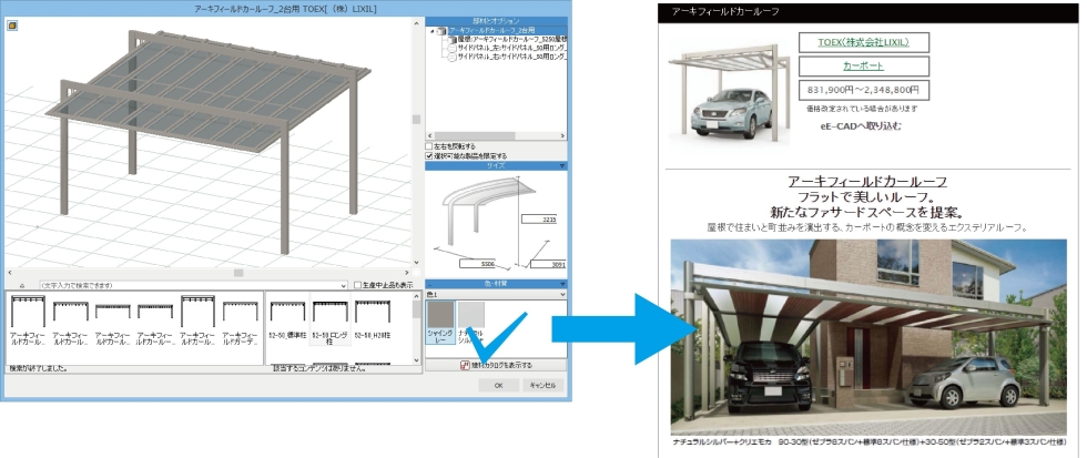 製品のオプションやパーツの色も、3D図形を見ながら変更できます。さらに、ワンクリックでデジタルカタログが開き、製品の詳細をパソコンで確認することができます。