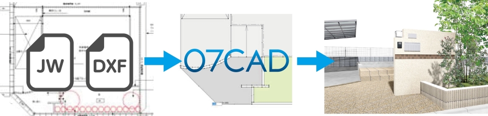 JWやDXFをO7CADに取り込みトレースすると、そのまま立体化に!パースまで作成できます。