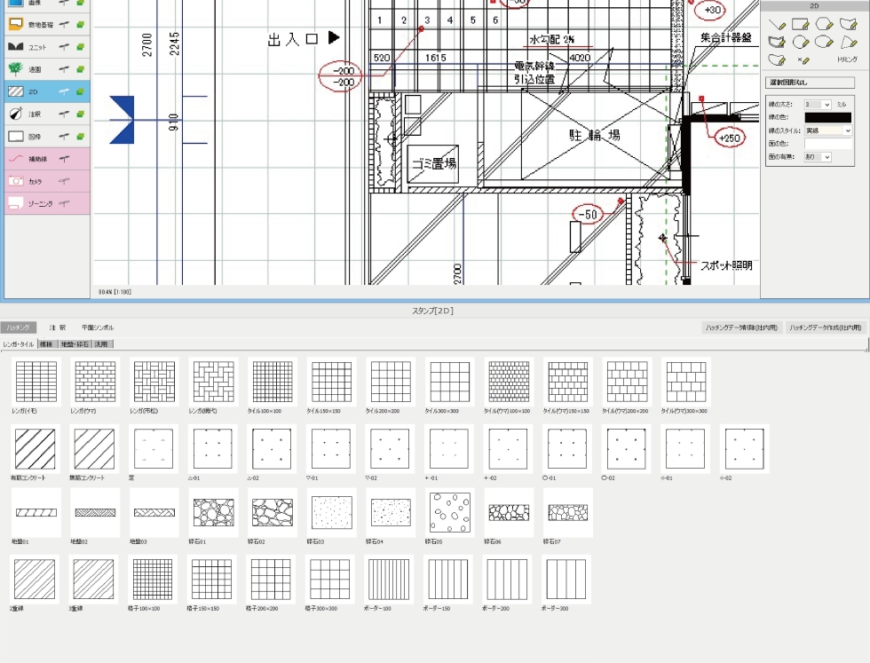 多彩な線種とハッチング、寸法注釈を備えたプロ用ツールです。ハウスメーカー等の仕様に合わせた図面に仕上げることができます。