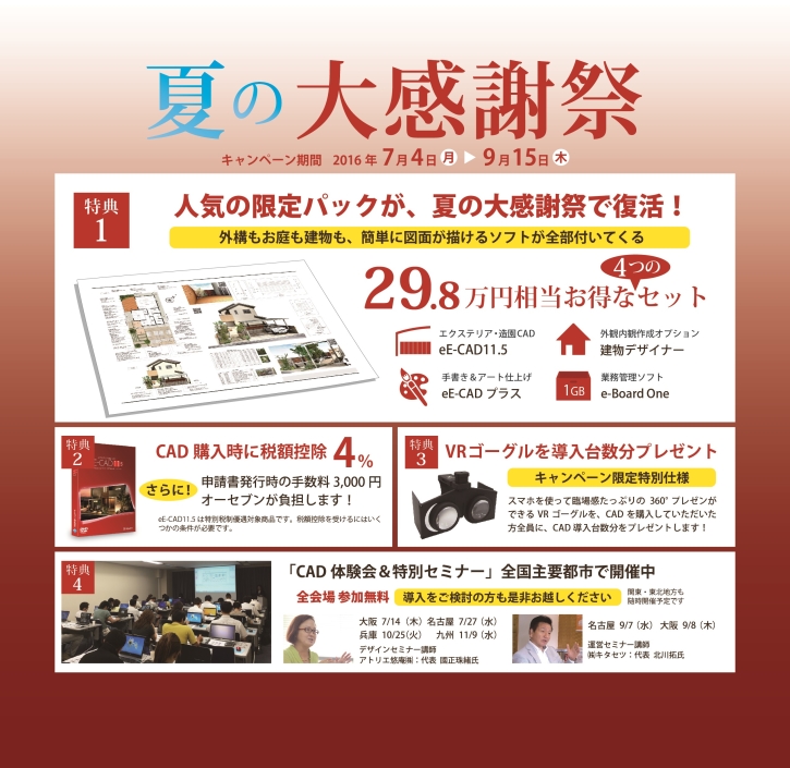 CADがお得なキャンペーン「夏の大感謝祭」の終了が近づいてまいりました。30万円相当のオプションソフトが無料で付いて、さらに、今話題のVRゴーグルも付いてきます。9月15日(木)までの限定パックです。CADをお考えの方は、お気軽にご相談ください。