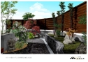 図面にある「大切なパートナー」とは、実はペット、犬たちのこと。そう考えると、背の高いフェンス、段差の少ないウッドデッキにも意味が見えてきます。バラに覆われた木製パーゴラのある一角はもちろんワンちゃんの憩いの場。ほどよい木陰表現がワンちゃん目線でも居心地良さそうに見えます。そして、ビンテージレンガ舗装の隙間の雑草(ハーブでしょうか?)がレタッチされており、少し経年変化した様子に見えるのが、生活感あって良い表現だと思いました。