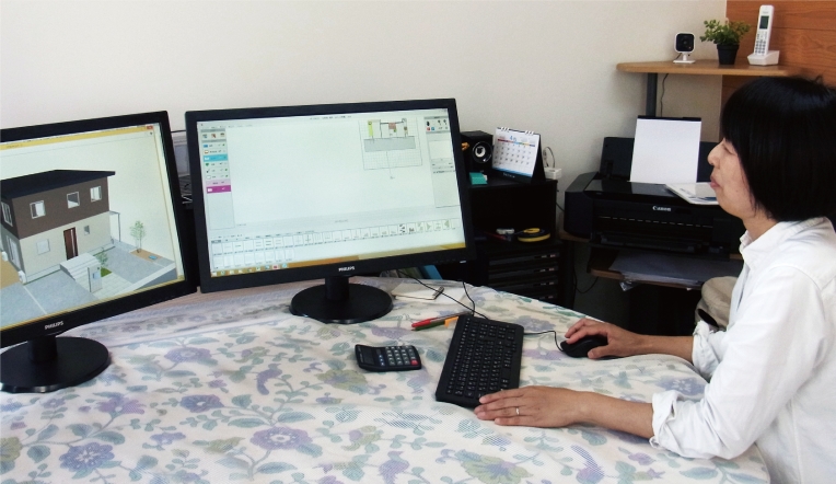 連絡が来たお客様には来社いただいて、今度は事務所にある2台のモニターを使って、お客様の希望を目の前でダイレクトに反映させながら打ち合わせを行います。