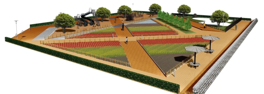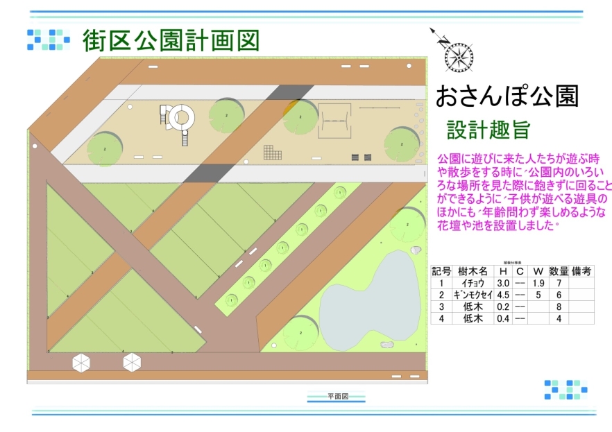 園内を楽しく散策できるよう、カラフルな花を配置した花壇を中心にした公園プラン。高木を控えめにしているため、映える写真が撮れるスポットにもなりそうです。