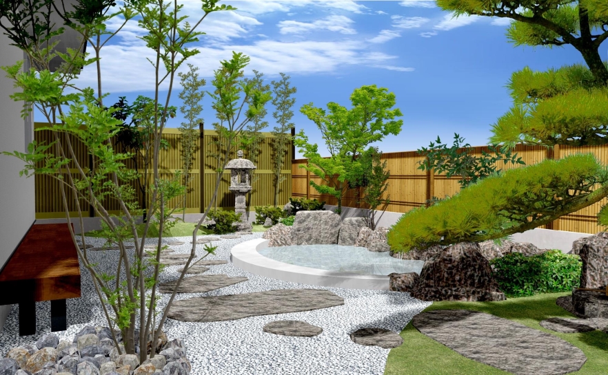 手前の雑木と主木の松が近景となり、主庭の遠近感を強調しています。その他のパースもアングル設定が絶妙で、制作者のセンスの高さを伺わせます。