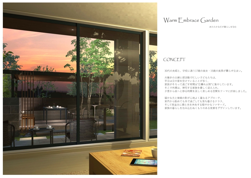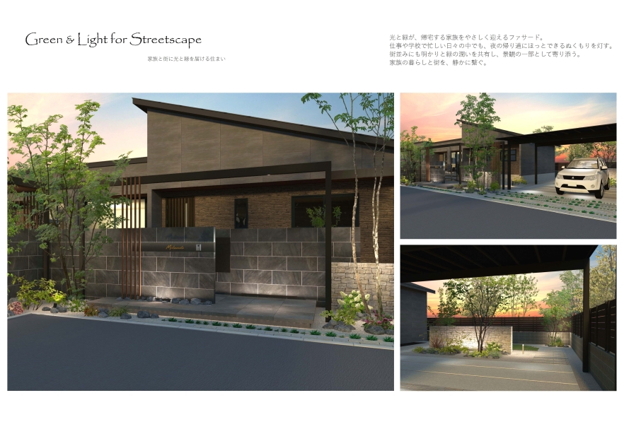 夕暮れの中帰宅した家族を暖かく迎えるエクステリア。それを重厚感のある石材と軽やかな植栽、そして何より、巧みな照明計画でまとめています。プレゼンの冒頭にある夕焼けの正面パースは、お施主様の心をつかむ魅力にあふれています。
