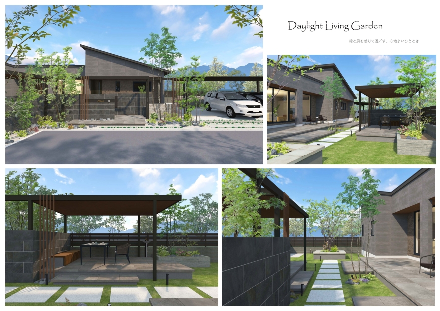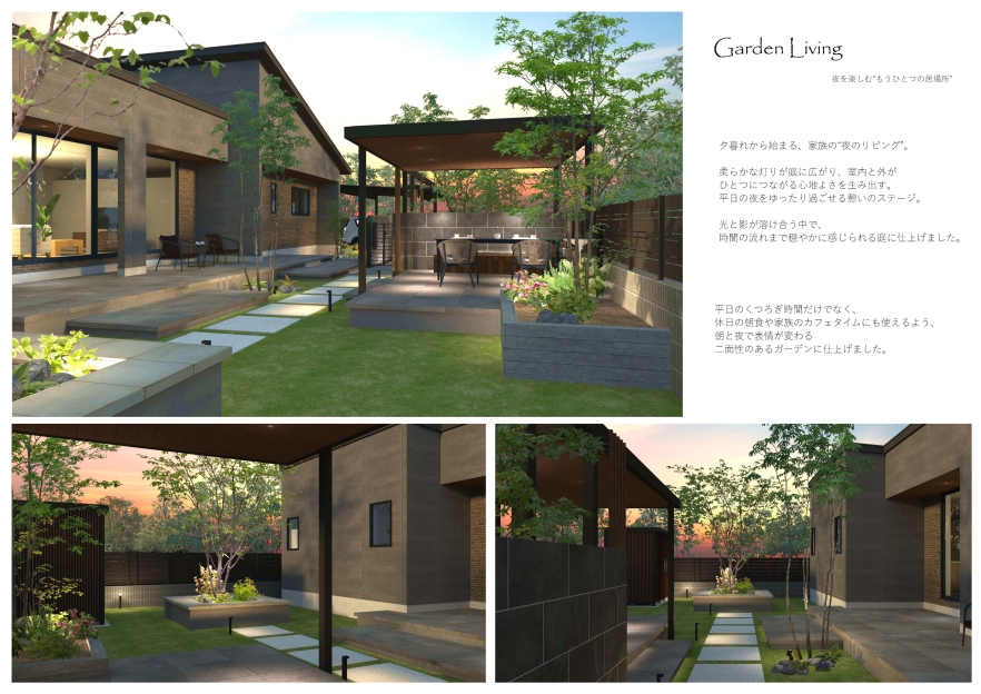 平日は帰宅後のわずかな時間をやさしく包み、休日は家族が自然と集まるテラスで穏やかな時間を過ごせるよう、光と陰が調和する心地よい外構・ガーデンを追求しました。