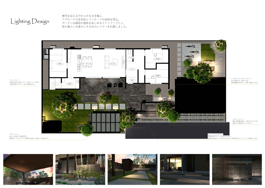 実際の提案では減らされがちな照明計画だからこそ、光が生む安心感や景観の豊かさを実感してほしいと考え、光の質と配置を丁寧に設計し、外構の魅力を最大限に引き出す表現を追求しました。