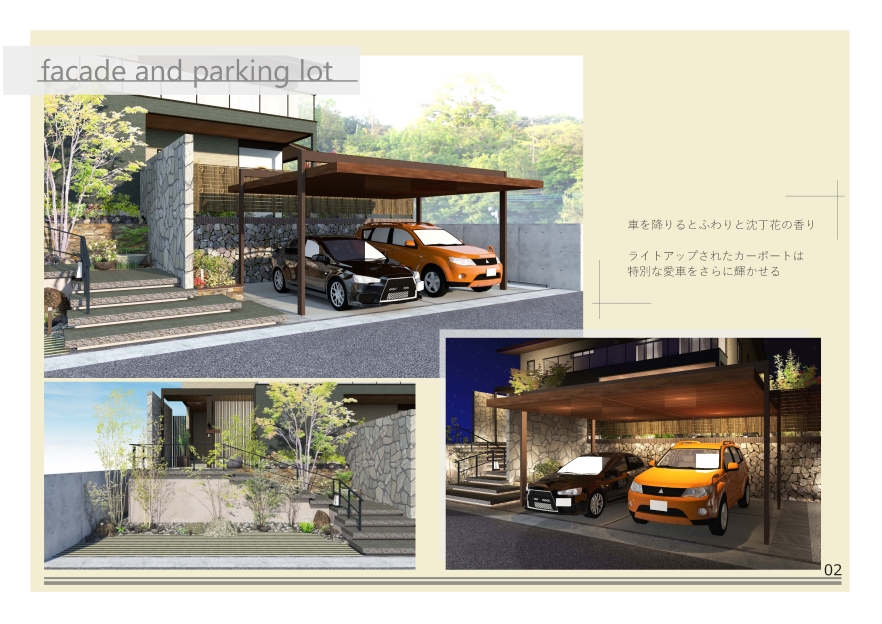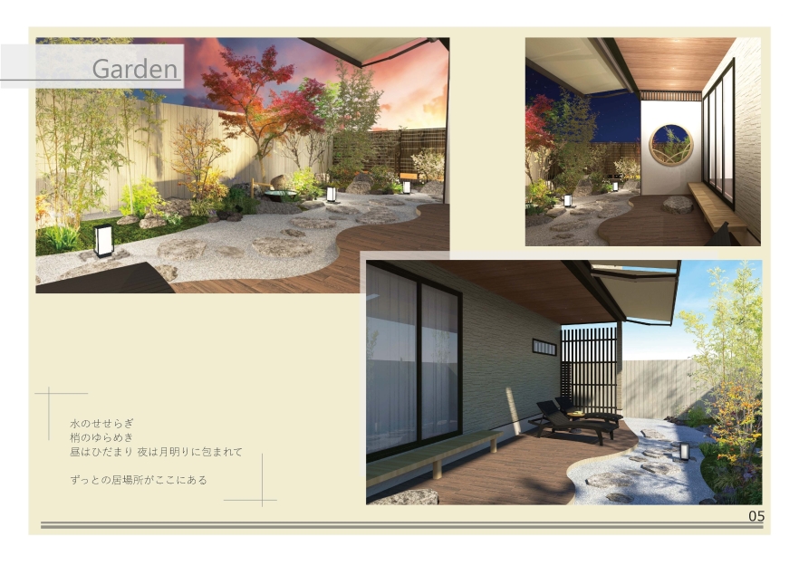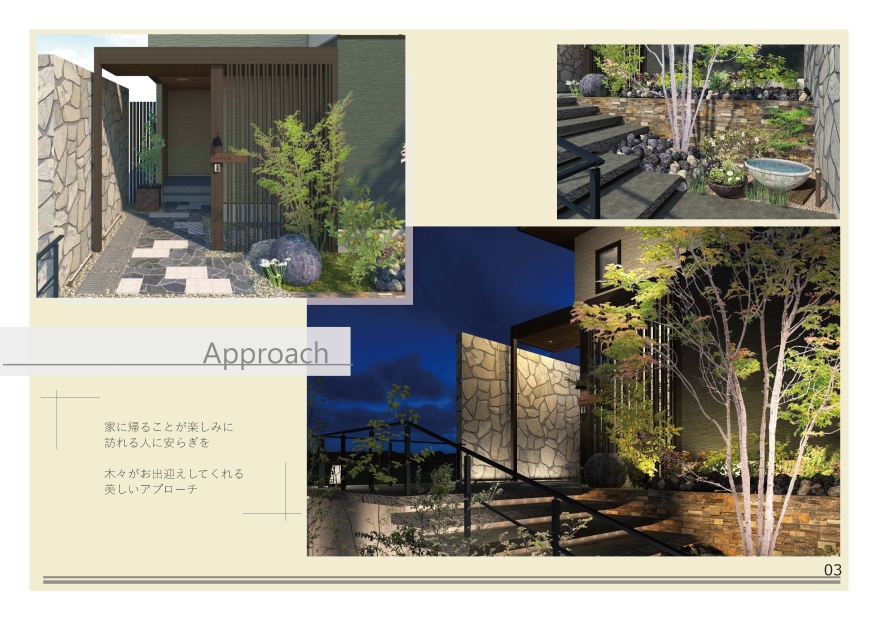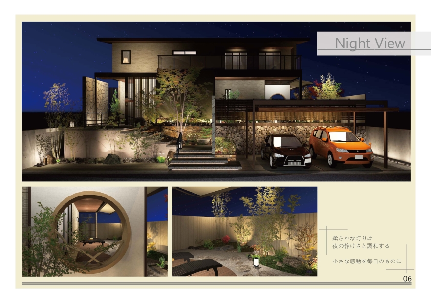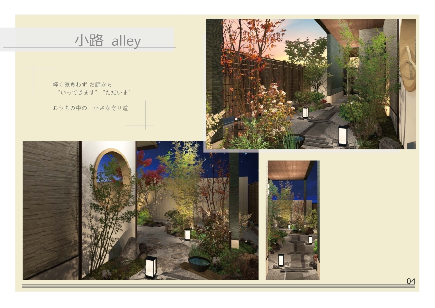 玄関わきの小路を通って庭に至る一連の景色も、夜景を中心にした雰囲気満点のパースで表現されています。