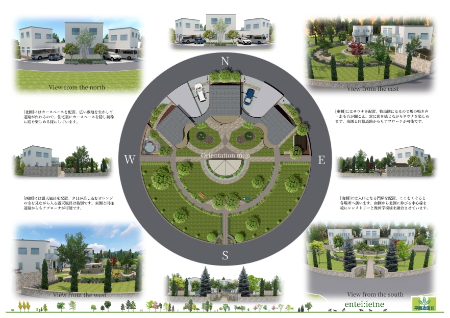北海道の競走馬生産牧場を営むお施主様の「とにかく面白い庭にしてくれ!」という要望に対し、敷地中心から幾何学パターンを展開した提案です。