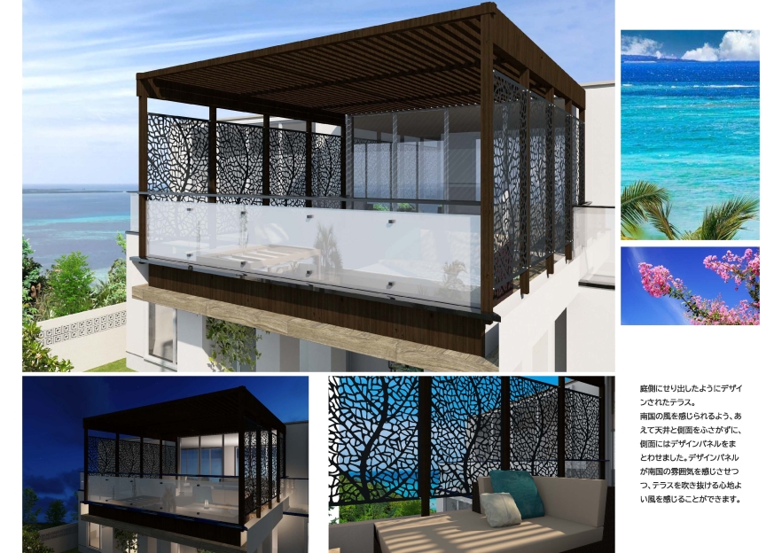 2階のせり出したテラスをどう表現しようか思案した結果、天井と側面はあえてふさがず、側面にはデザインパネルを配置することで、南の島の雰囲気を感じさせつつ、風と波の音を感じられる場所に仕上げました。