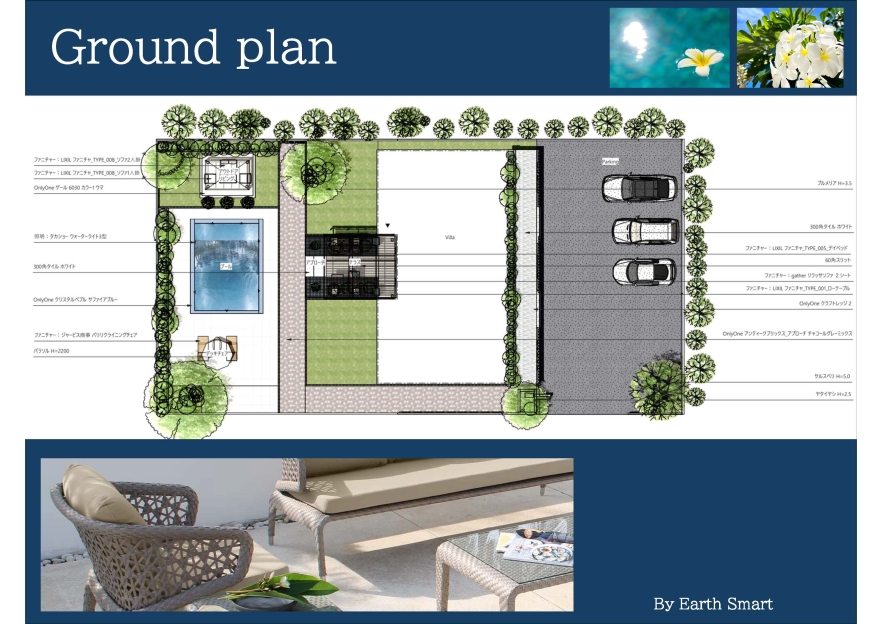 お庭には香りのよいプルメリアを配置し、視覚、聴覚、嗅覚、五感で愉しめるようにしています。