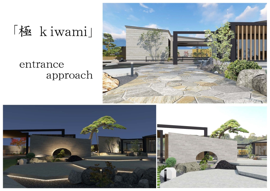 フロートステップやテラスでも8角形のデザインを採用し視覚的なデザインを演出し、アプローチの部分での「乱形」×「松」×「水面」は洗練された空間をイメージしました。