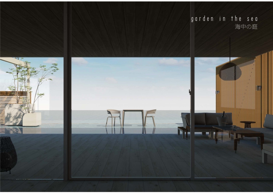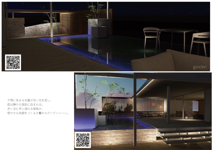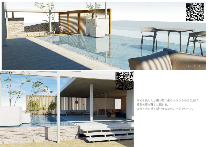 パースは庭側からの視点だけでなく、室内から水盤越しに外を眺めるカットも効果的に配置され、室内と庭、さらに海までの連続した視線のつながりを自然に伝えています。
