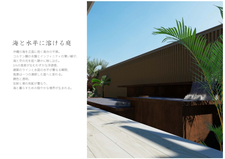 コルテン鋼の水盤とインフィニティプールを想起させる薄い縁が、水面に空と海の光を映し込み、建築のラインと静かに呼応します。