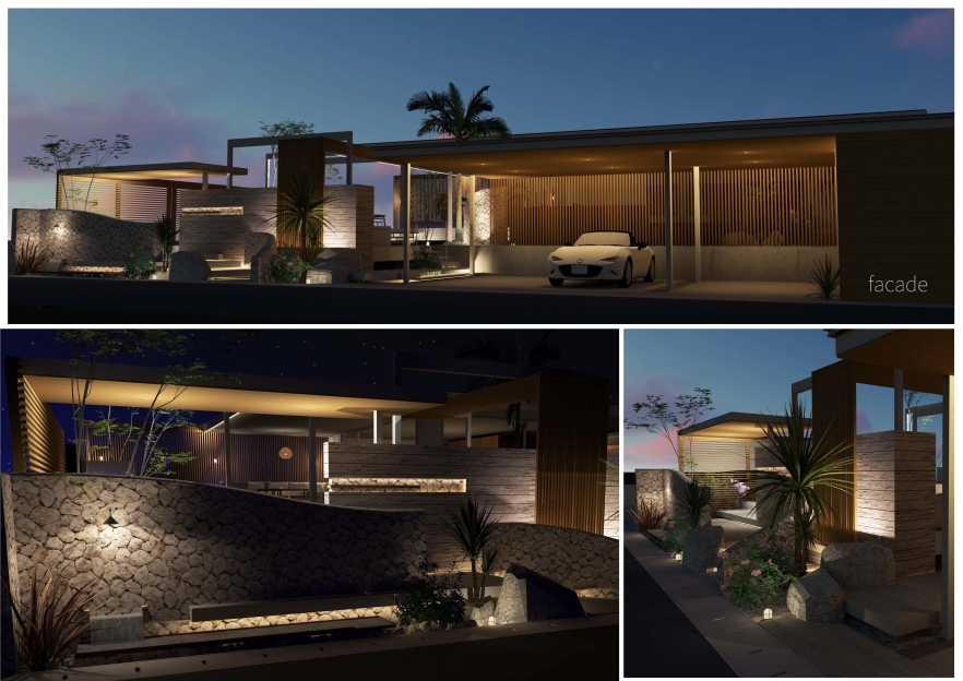 沖縄の海を正面に抱く高台に計画した、平屋住宅の外構デザインです。