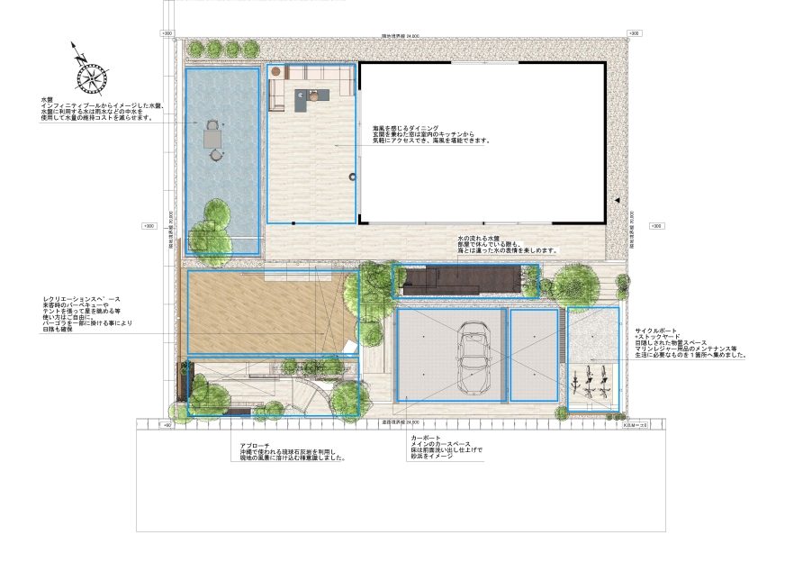 外構が単なる付帯ではなく、建築と自然の接続精度を高める“媒介”として機能することを意図したランドスケープ提案です。