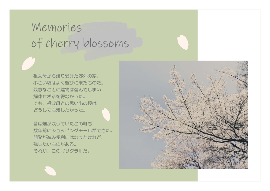 そこでその悩みを代表の山口に相談したところ、思い出の桜の木のアイデアを提案されました。