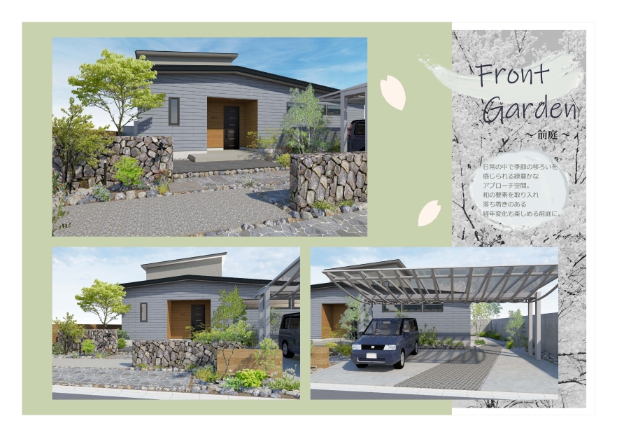 カーポートは、建物に合うモダンなデザインのものにし、和の要素とはミスマッチですが、なぜか違和感を感じない空間になりました。