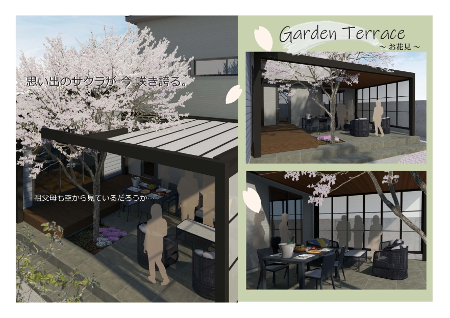 庭の中心には長年大切に育てられてきた思い出の桜が植えられ、あえて手前に配置しテラス屋根を抜くことで、天に向かって力強く生き生きとした姿を見せています。