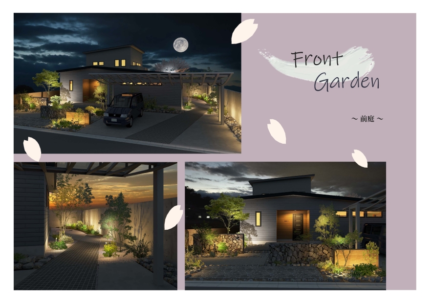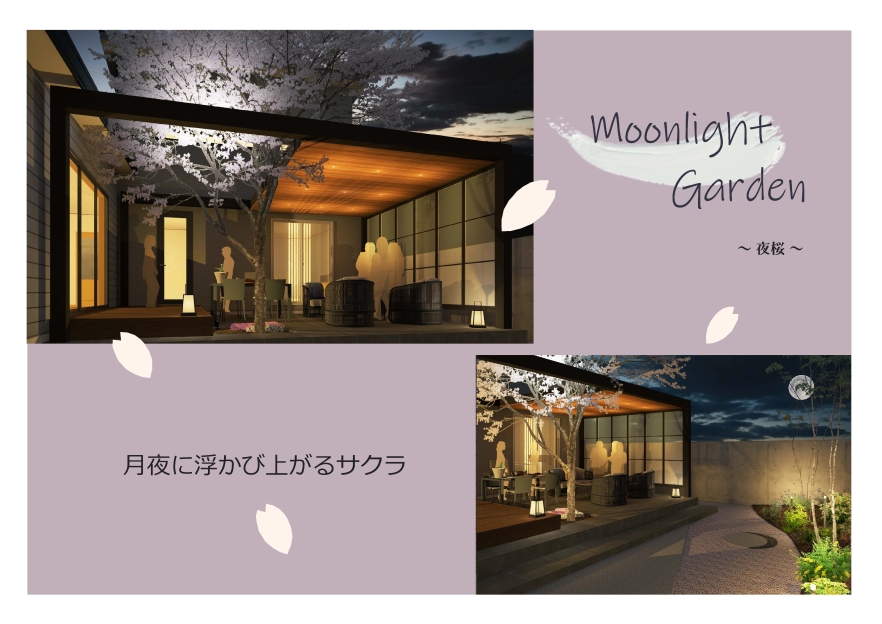 夜は足元をほのかに照らし安全性を確保しつつ、植栽をスポットで際立たせる演出により、昼夜それぞれ異なる表情を楽しめます。