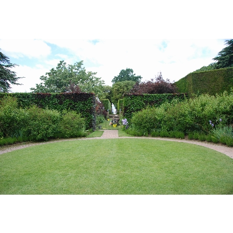 サークル、フクシア庭園、小鳥のトピアリー、水浴池、飾り屋根付きのサークルの 4っ庭が1軸に配置されていました。(差し渡し60m)。