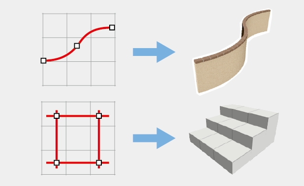 図面上の補助線に塀や階段、床などを選んで置くだけで平面と3Dが立ち上がります。直線も曲線も思い通りの形状に作成できます。