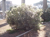 交通量の多いローマの街路樹によく見かけたキョウチクトウ(夾竹桃)という植栽です。6〜10月頃にかけて、桃色や赤・白花を咲かせます。強い毒性を持つ反面、比較的乾燥にも耐えて、塩風や公害にも強い特徴をいかして、日本では広く高速道路の沿道、海岸、街路樹、工場地帯や都会の緑地植物として植栽されています。原爆の放射能汚染にも耐えうる事から、広島や長崎の市花となっています。
