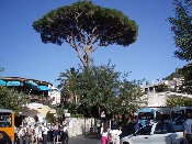 〔拡大図〕イタリアの松の木です。傘のように上部に葉が広がっています。