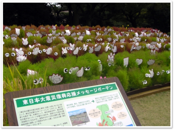 メッセージを書いたコキアは被災地の国営ひたち海浜公園と国営みちのく公園から日比谷公園にやってきました。コキアが戻る頃には綺麗な秋色になっているでしょうね。