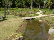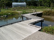 園路を歩くと自然とビオトープに達し、橋を渡りながらじっくりと水の中を観察することができます。
