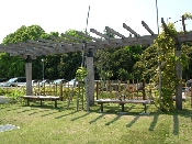 ビオトープ横にはパーゴラとベンチ。散歩に疲れたお父さんお母さんがお子さんの様子を見ながら休憩できます。
