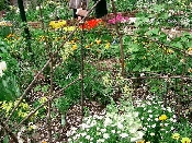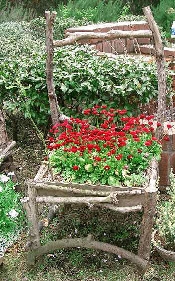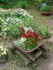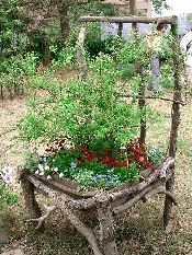手押し一輪車の台を利用したコンテナです。下に丸太を積んで高さを調節してあります。錆びた鉄色が土と馴染んでいますね。壊れてしまったものもリサイクルで素敵なコンテナになります。
