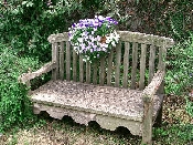 ベンチにハンギングバスケットがあるだけで絵になります。庭の片隅に置くと自然とフォーカルポイントになります。大きな落葉樹の下や生垣の前、ガセボやパーゴラの下などいろいろな所に置けます。