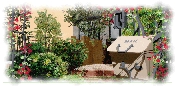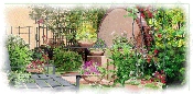 ■ 1.平面図 /一部分にレンガ縁取りを組んだY系色のカラーコンクリート「石貼り模様仕様+無地仕様」仕上げと門袖とアプローチに敷いた「枕木」の組み合わせ。ポストやアーチ、トレリスなどのエクステリアエレメントが住人の個性を表現しています。〔拡大図〕