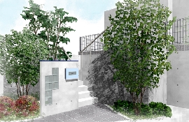今回の図面のように、高低差がある宅地の場合の(今回は1.5メートル程)典型的なプランとしては、階段と手摺、機能門柱などをつけて「はいおしまい!」というパターンが多かったですね。でも、最近は手作り門柱をエクステリアのデザインポイントとして計画したりするパターンが増えています。