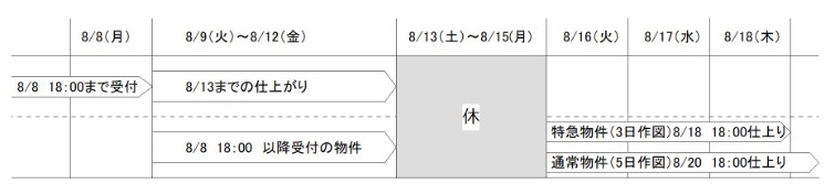 通常物件(5日〜作図):2022年8月20日(土)以降の仕上がり となります。