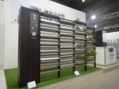 『ルーバーフェンス』は、建築家コラボのユニークなものがありました。植栽を植えることのできるオリジナルパネルは、素材やパネル配置が、水やりの循環に合わせて緻密に計算されていて、好きな植物で壁面緑化が楽しめます。染色廃棄物をリサイクル利用した発泡セラミックを用いた環境配慮型のルーバーです。