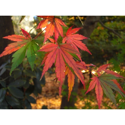 ![]() 日の当たる部分から紅葉します。半分だけ紅葉した紅葉もきれいですね。 | ![]() |