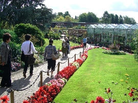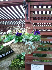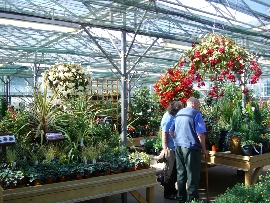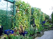 〔拡大図〕商品の展示もセンスの良さ 管理能力の高さなどを感じさせます。お店の信用力が問われるのでしょうね。つた植物が温室の壁にまきついています。このつたも 幾つもの種類を混植していました。とくに この朝顔(実は昼もちゃんと咲いています)がいい。イギリスの庭は 一つ際立つようなデザインは好まない。互いに絡ませて味をだす そんな風情が好きなようですね。