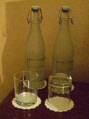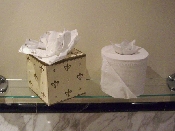 炭酸水と2種類の水が用意されていました。但し書きで ビンは持っていかないこととありました。ティッシュは花のようなあしらいをしてディスプレィしていました。