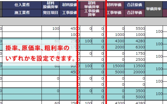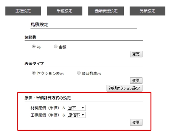 材料単価、工事単価の計算方法を掛率、原価率、粗利率のいずれより選択することができるようになります。(従来は原価に対する掛率のみ。)