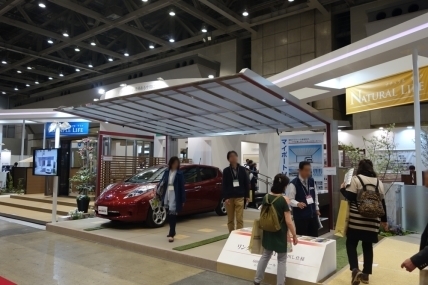![]() さて、ようやく西2ホールへ移ってきました。通路を抜けてすぐに目に入るのは、木造門塀を数多く手がける大林のブース。木造鉄骨ハイブリッド構造のFIT工法で門構えを造り、数寄屋門で培われた木製建具の技術で格子の自動引き戸を取付。 | ![]() |