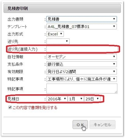 〇見積書および請求書の書類出力の際に、送り先を直接入力できるようになります。