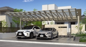 独特の屋根形状で、圧倒的な存在感を放つ、新スタイルカーポート。空へとつながる開放感のあるカースペースを演出します。