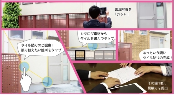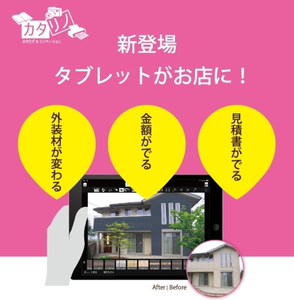 取り込んだ写真に塗装やタイルなどのテクスチャ、建材イメージを貼り付けイメージ提案するツール「カタリノ」を会場でご紹介。そして、5月のリフォーム展示会で発表した新商品「My展示場」もあわせてご紹介します!
