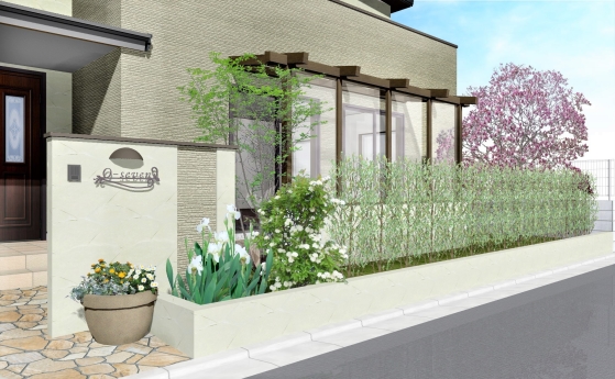 (門柱前の寄せ植えと、奥に見えるシモクレン)