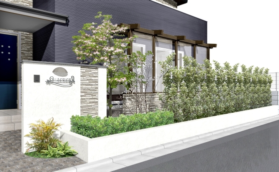 (門柱前の寄せ植えと、ハナミズキ、ジューンベリー、マサキの生垣)