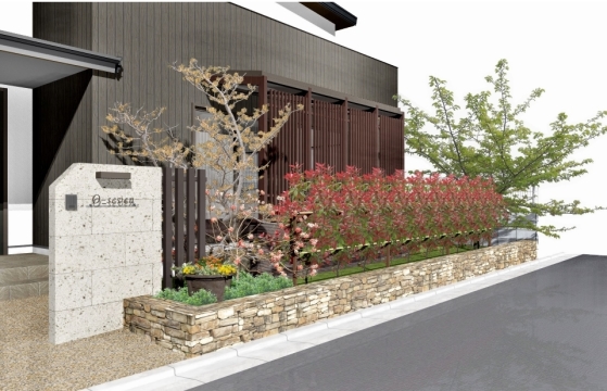 (門柱前の鉢植えの中の黄色いビオラ、マンサク、ミツマタ、レッドロビンの生垣、カワヅザクラ)