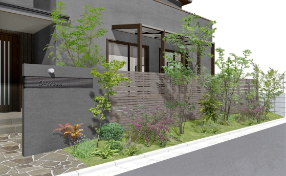 (門柱後ろ:シマトネリコ 門柱前:コハウチワカエデ
